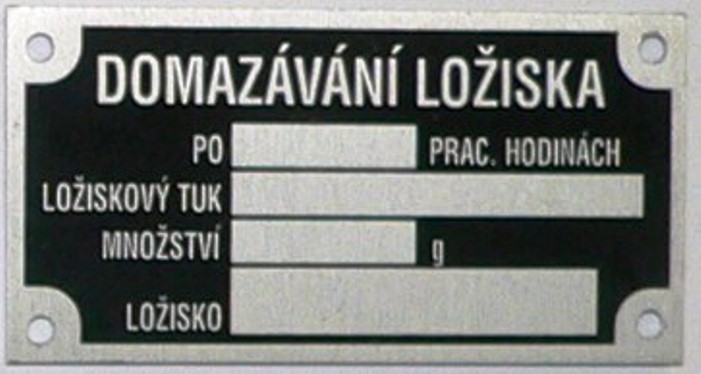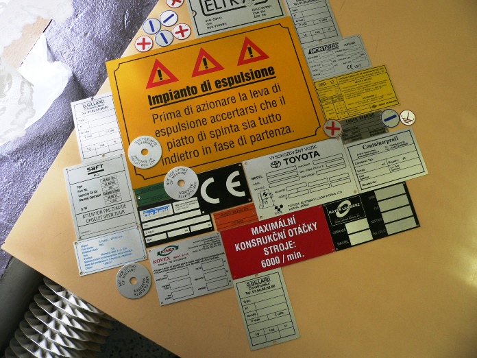 Používaný materiál je AL plech o síle 0.5, 1 a 2 mm a dále dle požadavku odběratele, barevnost výrobku dle vzorníku RAL základní škála odstínů, u kterých je garantována barevná stálost i po tepelném zpracování. Štítky se používají na označení výrobků, strojů a zařízení, ke značení DKP, HIM, ovládacích panelů.